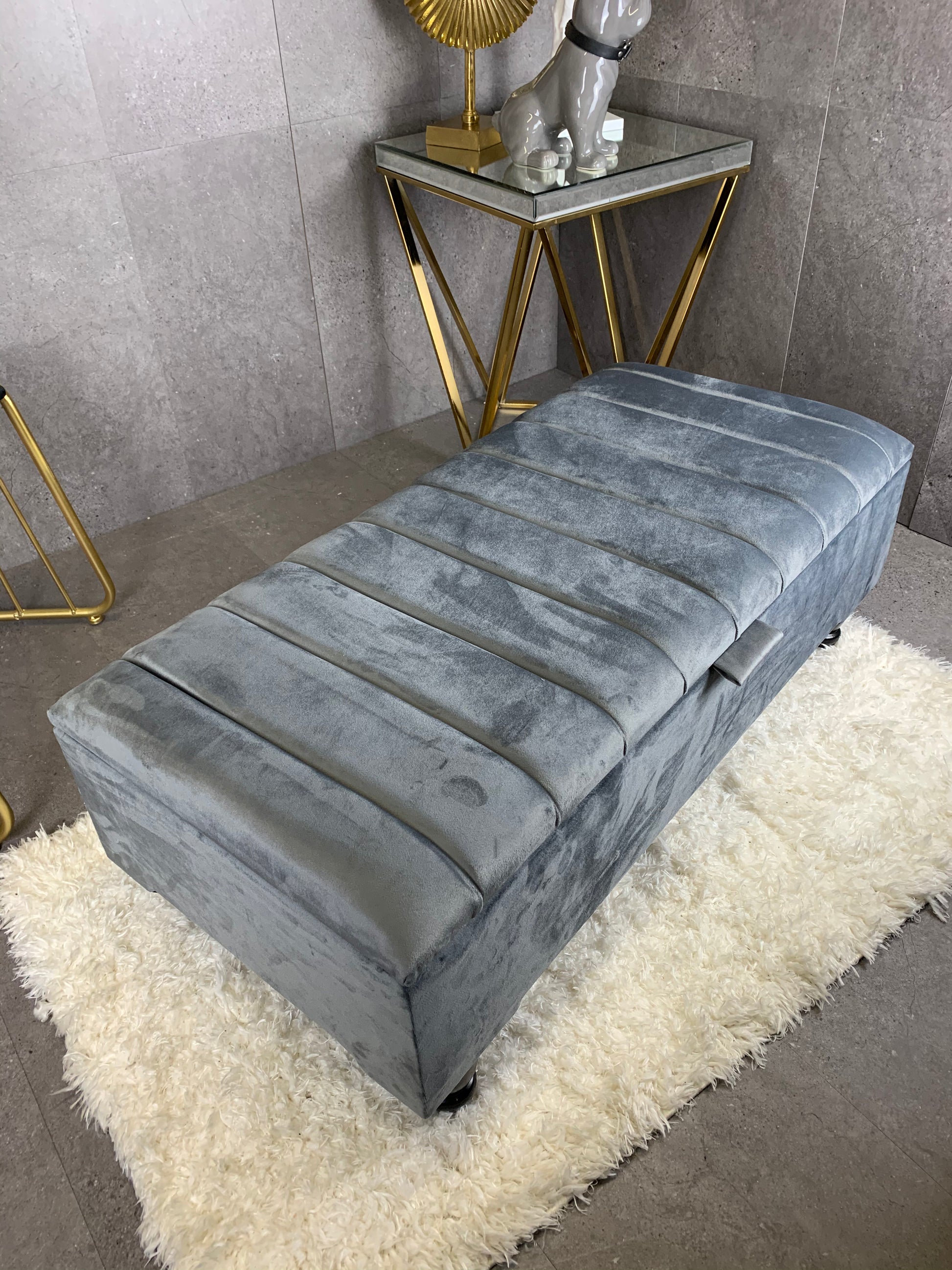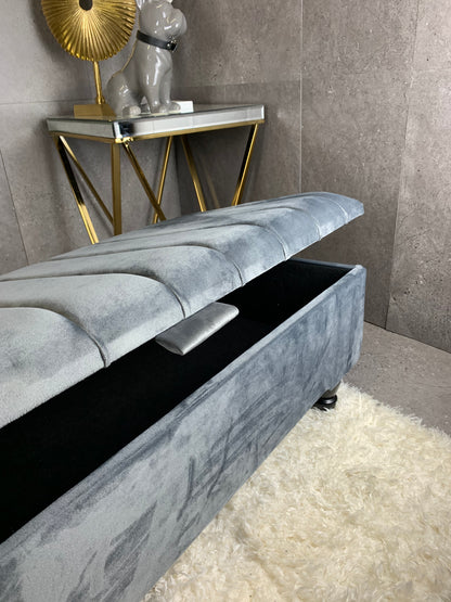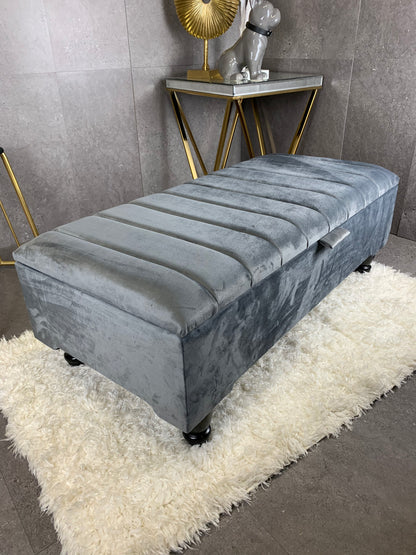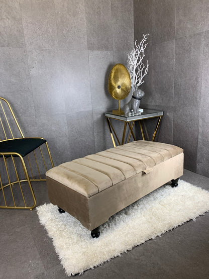 Upgrade your living space with this Rectangle Line Panel Storage Bench, a versatile piece that works as a footstool, ottoman, coffee table, or extra seating. Upholstered in soft velvet with a solid wood frame, this bench blends modern style with everyday practicality.
